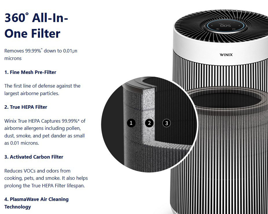 Winix True HEPA: Captures 99.99% of airborne allergens including pollen, dust, smoke, and pet dander, as small as 0.01 microns