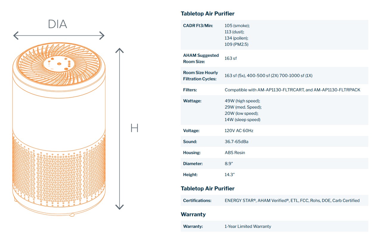 Breathe easy. Featuring superior air purification and energy efficiency with AHAM Verified® and ENERGY STAR® certifications, the Simply Conserve® Tabletop Air Purifier is the ideal portable solution for improving wellness, effortlessly saving energy, and lowering utility bills. Its patent-pending Advanced Cartridge uses a 3-stage purification system with a replaceable True HEPA H13 and Carbon composite filter to efficiently remove pathogens, toxins, allergens, asthma triggers, and odors— keeping homes healthier while significantly reducing replacement filter cost and landfill waste. Intuitive touch settings for varied filtration speeds and run-times make operation a breeze.